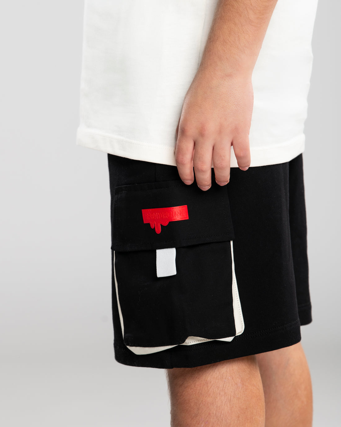 Cargo pocket on one cotton twill leg with gussets and contrasting details and silicone patch on flap.