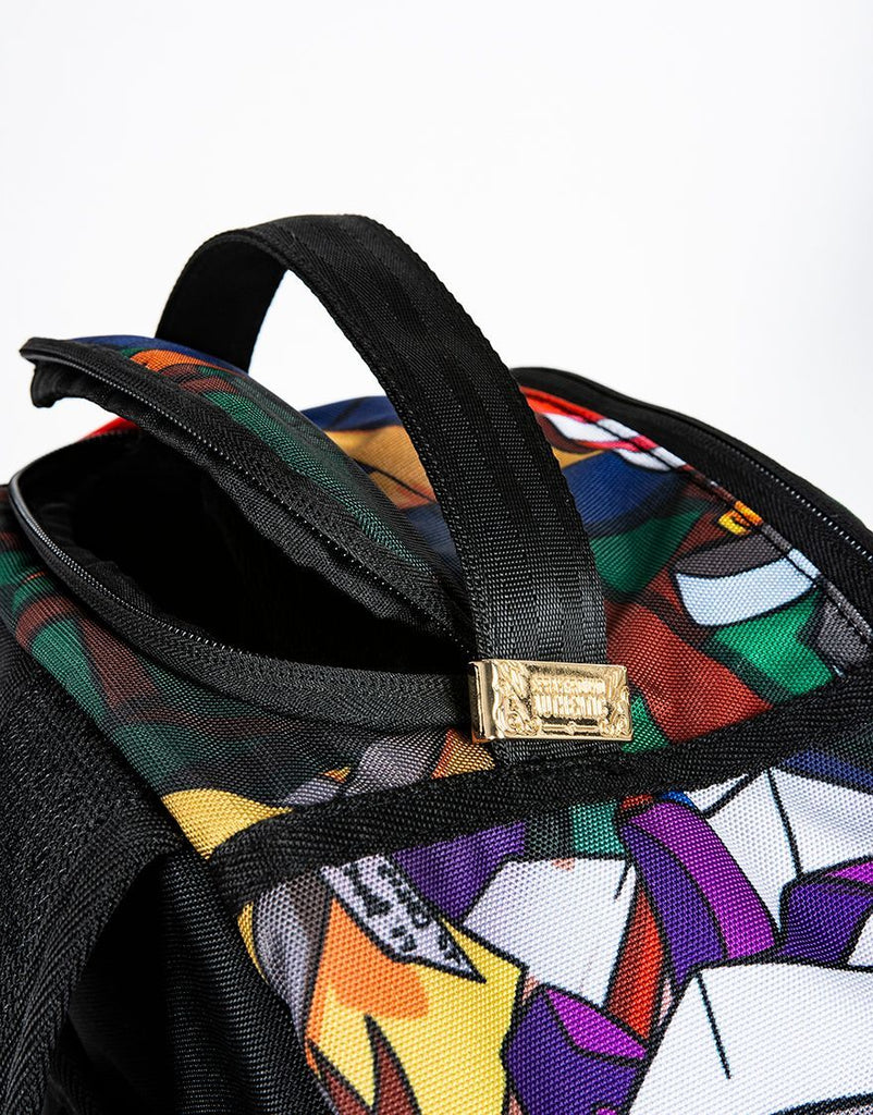 Dimensions: 18" x 6" x 11.5" • Front zipper pocket • Side pockets • Zippered Stash pocket • Separate velour sunglass compartment • Ergonomic mesh back padding • Adjustable Straps for custom sizing • Gold zippers with metal hardware • Metal "Sprayground Authentic" badge • Slide through back sleeve connects to carry-on luggage to free your hands