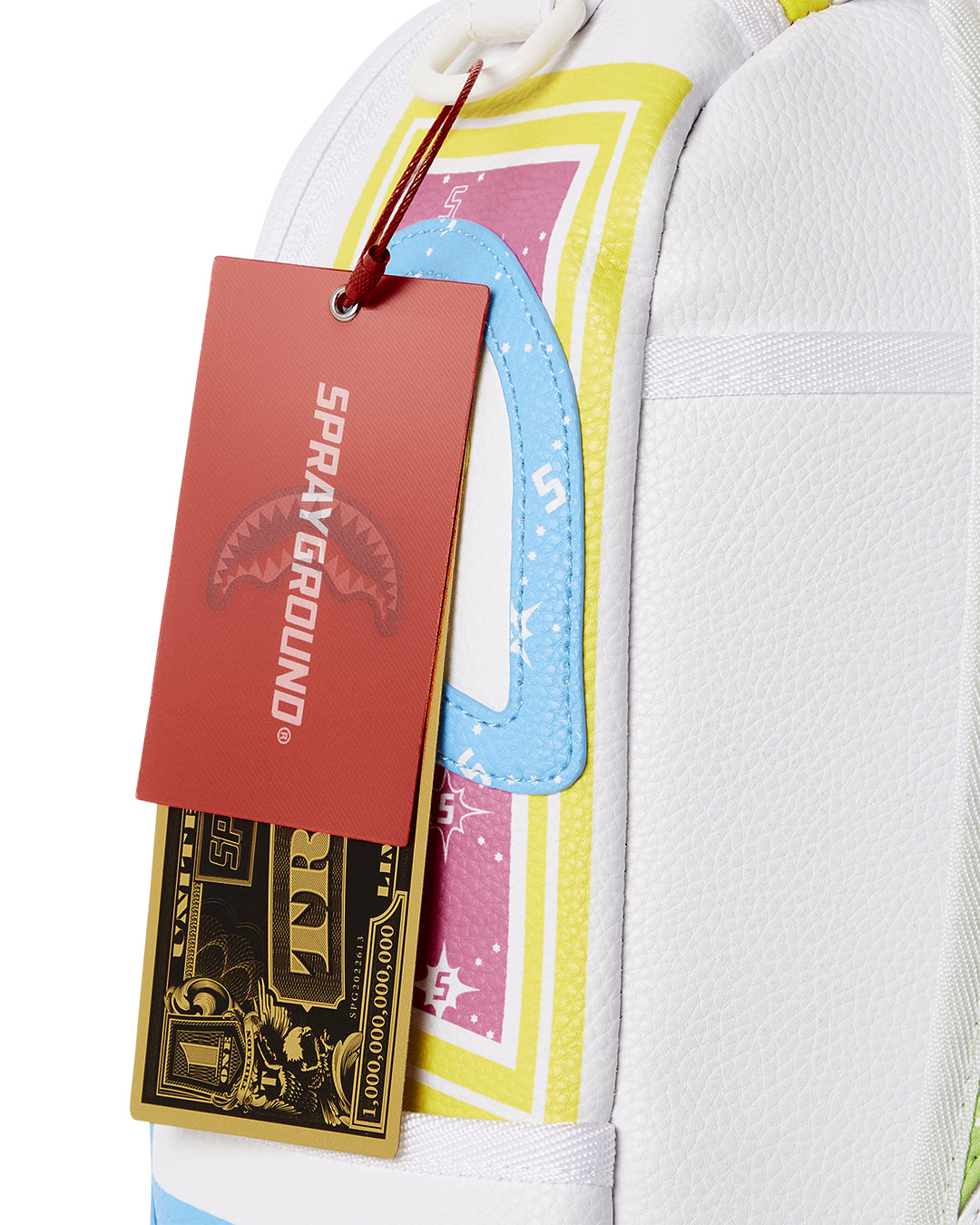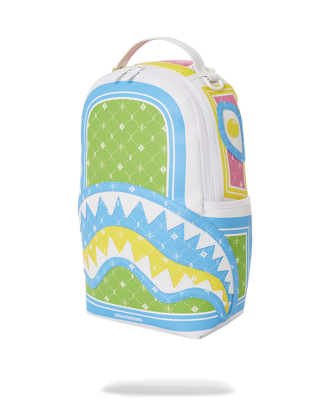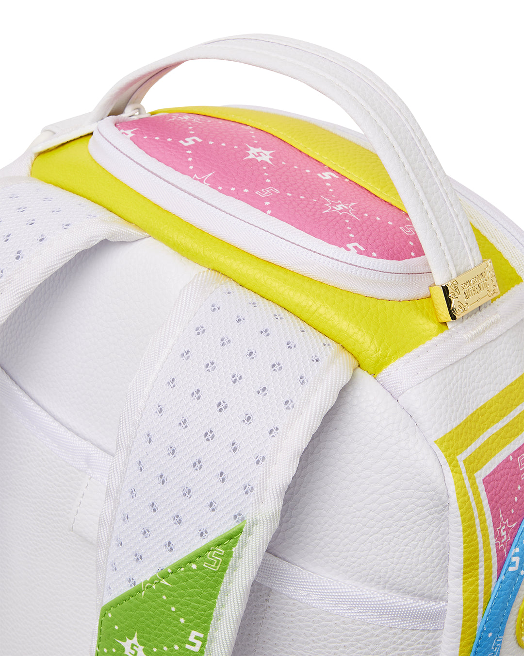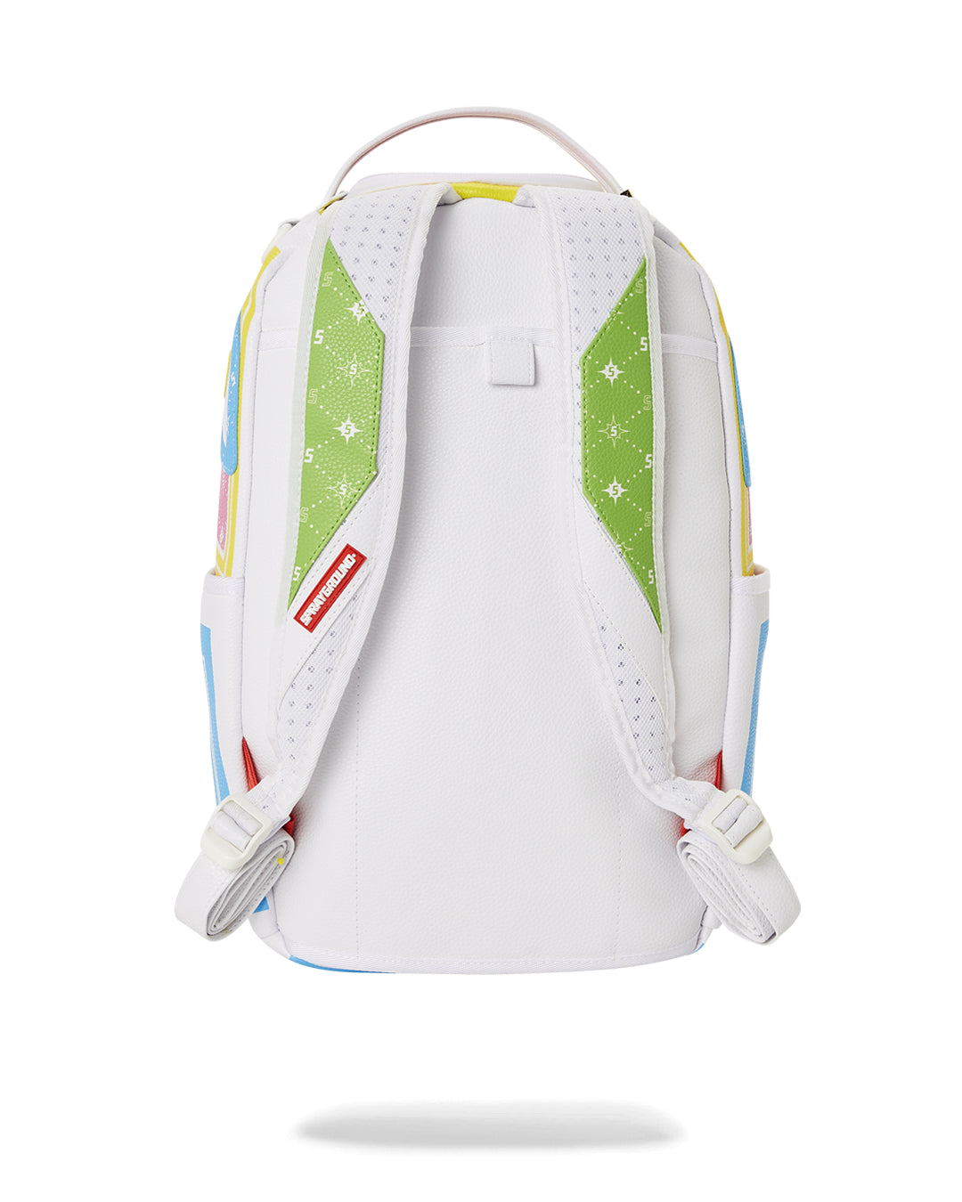 Dimensions: 18" x 6" x 11.5" • Front zipper pocket • Side pockets • Zippered Stash pocket • Separate velour sunglass compartment • Ergonomic mesh back padding • Adjustable Straps for custom sizing • Gold zippers with metal hardware • Metal "Sprayground Authentic" badge • Slide through back sleeve connects to carry-on luggage to free your hands