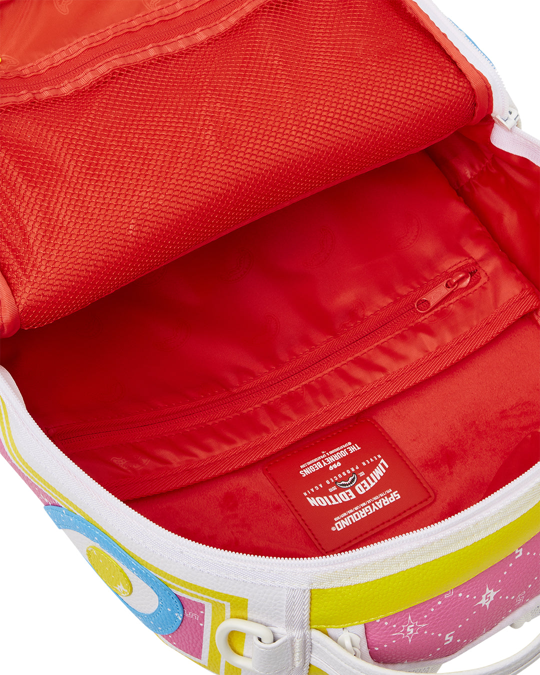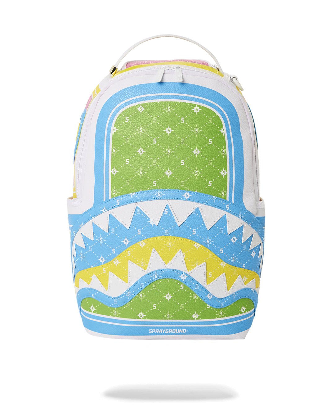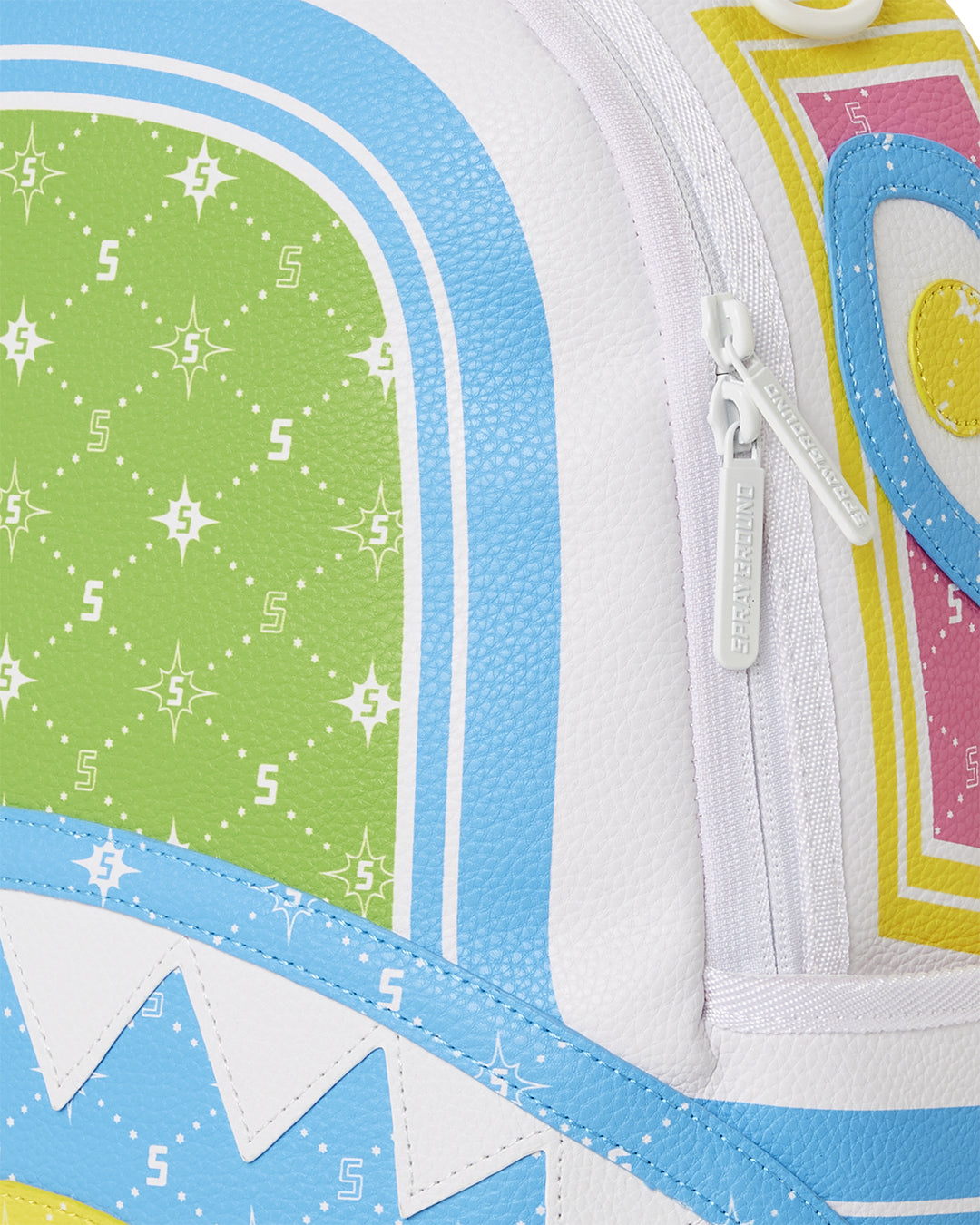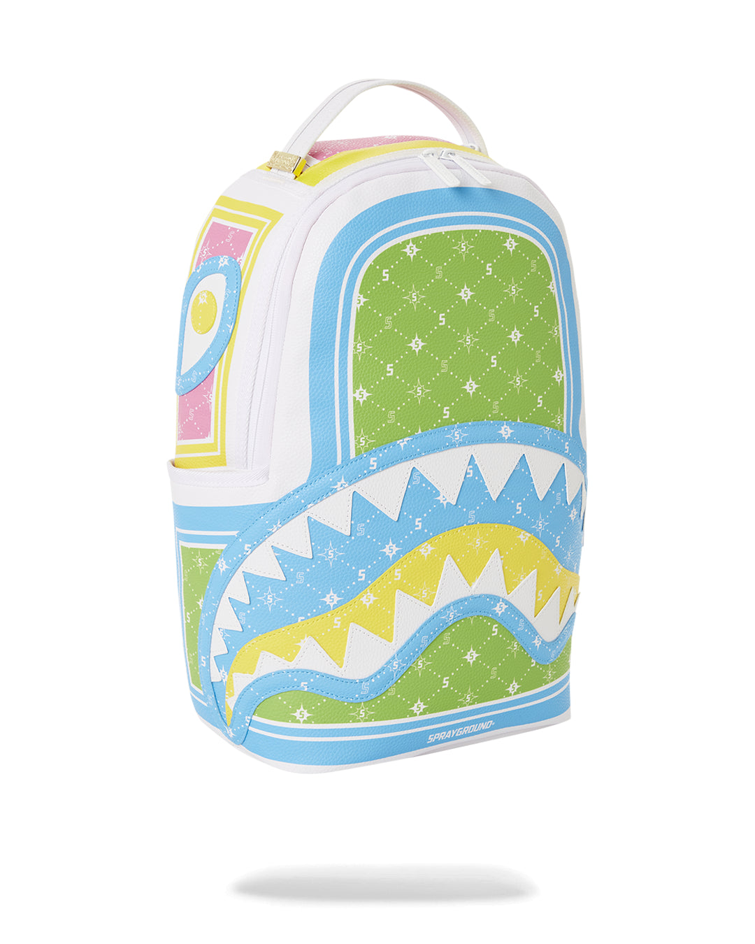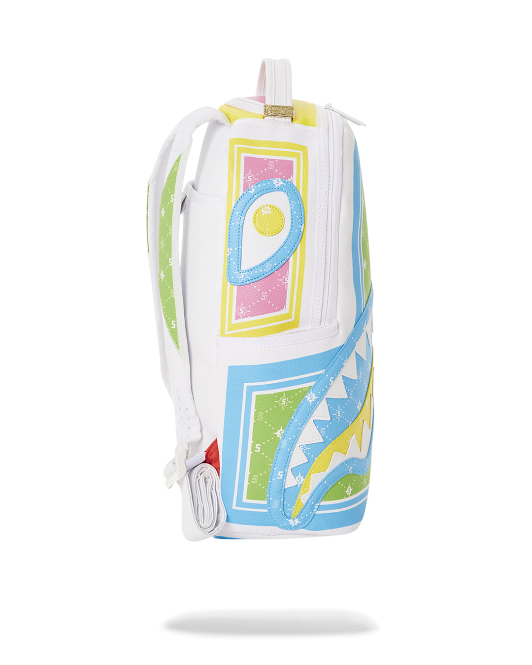 Dimensions: 18" x 6" x 11.5" • Front zipper pocket • Side pockets • Zippered Stash pocket • Separate velour sunglass compartment • Ergonomic mesh back padding • Adjustable Straps for custom sizing • Gold zippers with metal hardware • Metal "Sprayground Authentic" badge • Slide through back sleeve connects to carry-on luggage to free your hands