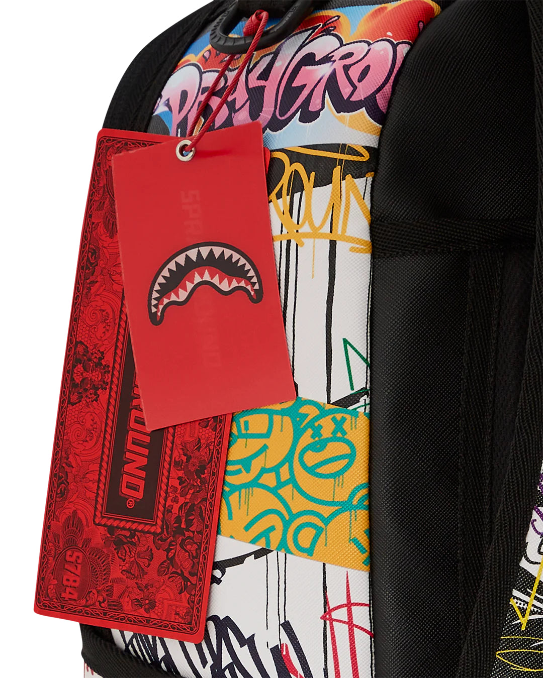 ExteriorDimensions: 18" x 6" x 11.5" • Front zipper pocket • Side pockets • Zippered Stash pocket • Separate velour sunglass compartment • Ergonomic mesh back padding • Adjustable Straps for custom sizing • Gold zippers with metal hardware • Metal "Sprayground Authentic" badge • Slide through back sleeve connects to carry-on luggage to free your hands