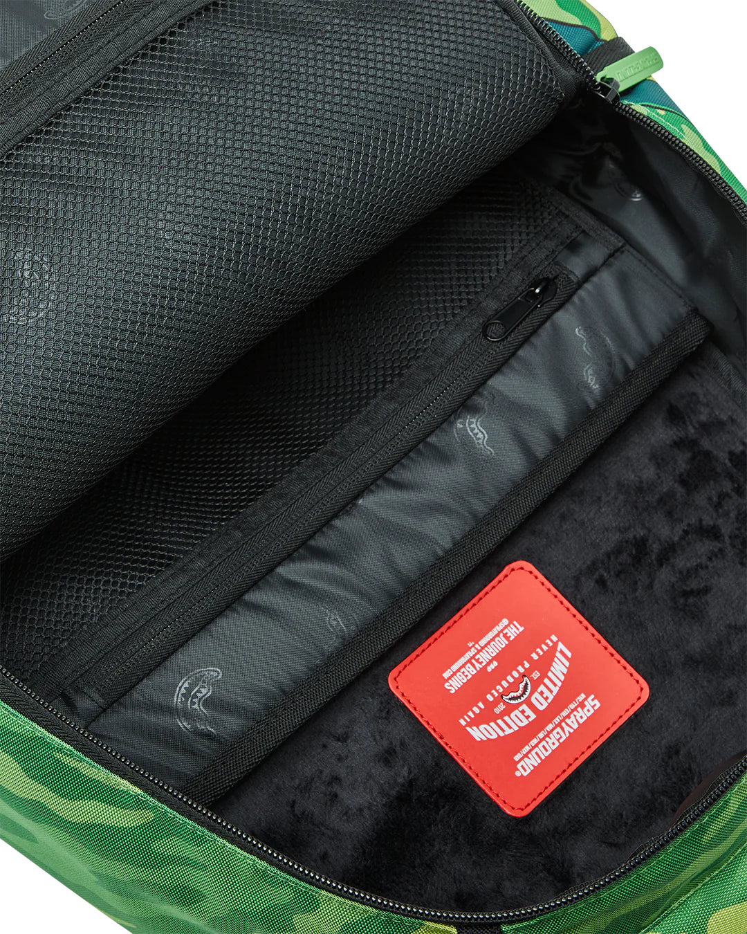 Dimensiones: 46cm x 15cm x 29cm - Bolsillo frontal con cremallera - Bolsillos laterales - Bolsillo con cremallera Stash - Compartimento separado para gafas de sol de terciopelo - Acolchado trasero de malla ergonómico - Correas ajustables para personalizar el tamaño - Cremalleras doradas con herrajes metálicos - Insignia metálica "Sprayground Authentic" - La funda trasera deslizante se conecta al equipaje de mano para liberar las manos