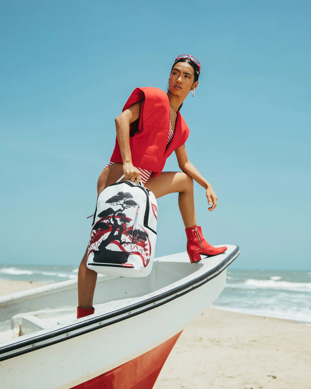 Dimensions : 46cm x 15cm x 29cm • Poche frontale avec fermeture à glissière • Poches latérales • Poche cachée avec fermeture à glissière • Compartiment séparé en velours pour lunettes de soleil • Rembourrage arrière ergonomique en maille • Sangles réglables pour tailles personnalisées • Charnières rouges avec élément en métal • Badge "Sprayground Authentic" en métal • La manche arrière se connecte à votre bagage à main pour libérer vos mains