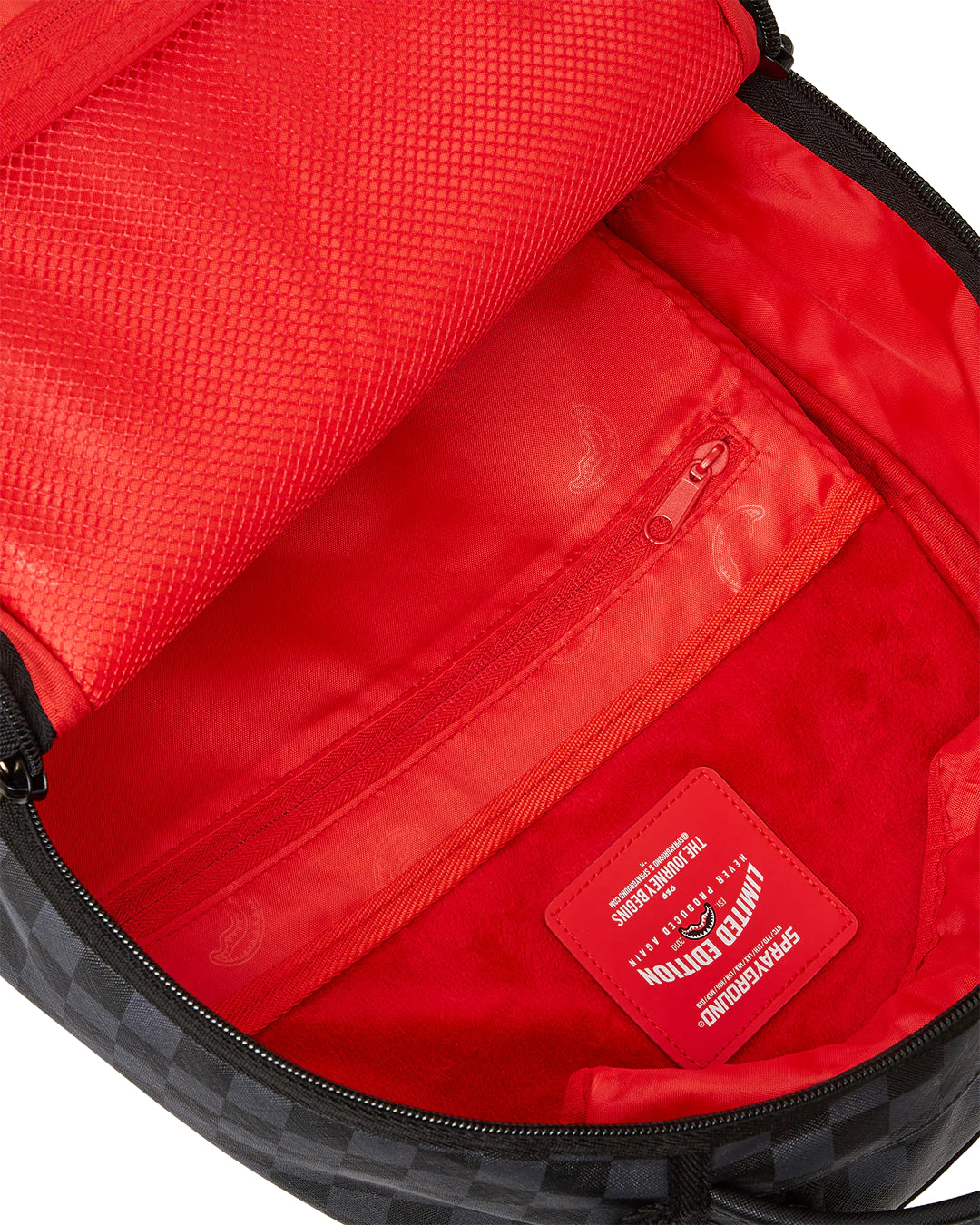 Dimensions : 46cm x 15cm x 29cm • Poche frontale avec fermeture à glissière • Poches latérales • Poche cachée avec fermeture à glissière • Compartiment séparé en velours pour lunettes de soleil • Rembourrage arrière ergonomique en maille • Sangles réglables pour tailles personnalisées • Charnières rouges avec élément en métal • Badge "Sprayground Authentic" en métal • La manche arrière se connecte à votre bagage à main pour libérer vos mains