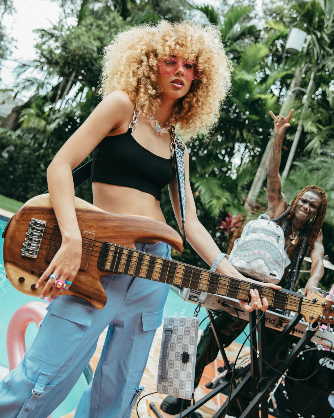 Pochette con cinturino da polso rimovibile, maniglia sul pannello frontale, chiusura a zip, 1 tasca interna.