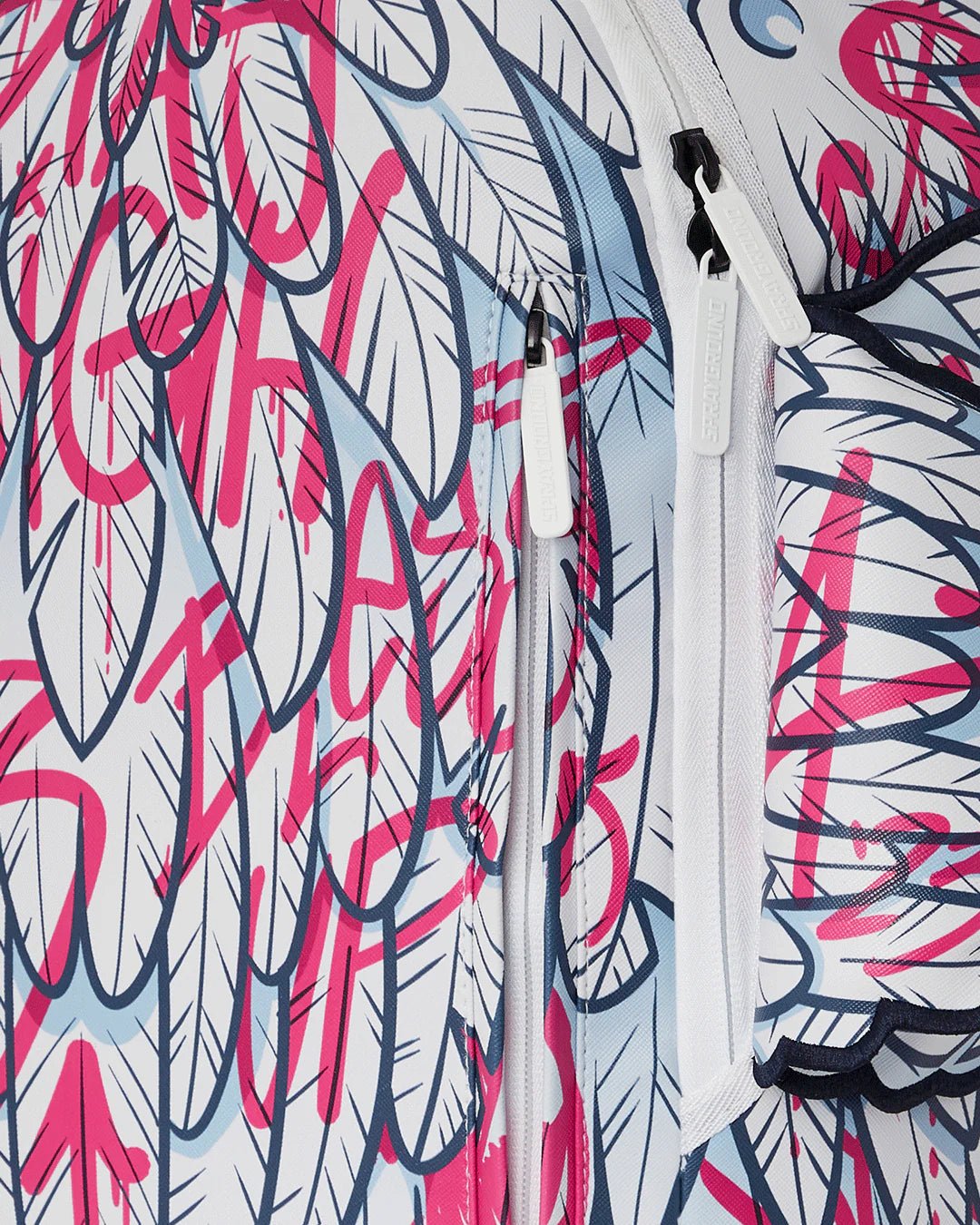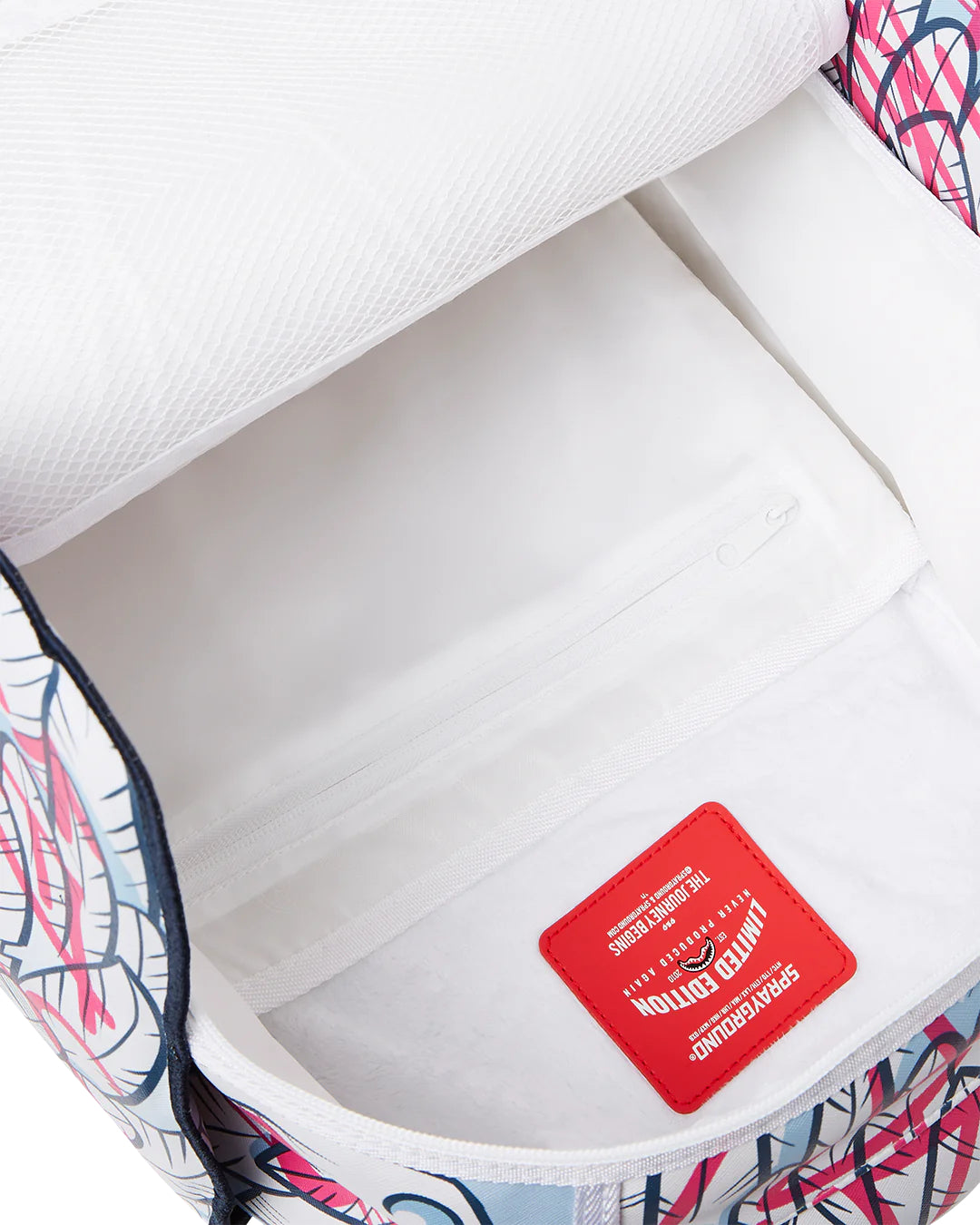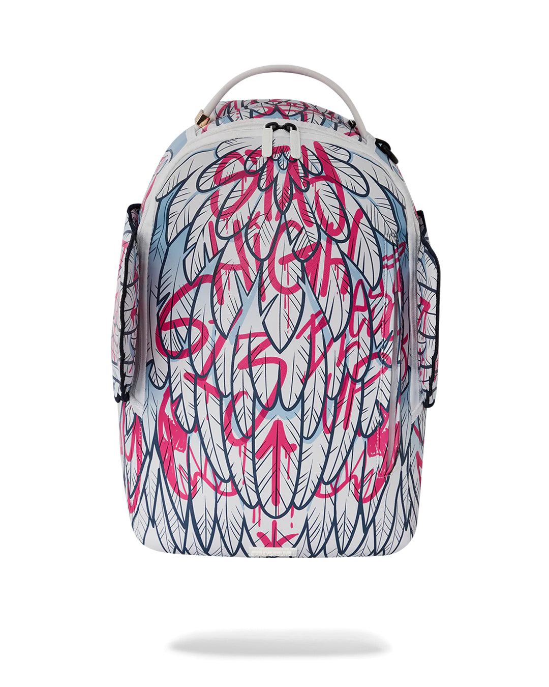 ExteriorDimensions: 18" x 6" x 11.5" • Front zipper pocket • Side pockets • Zippered Stash pocket • Separate velour sunglass compartment • Ergonomic mesh back padding • Adjustable Straps for custom sizing • Gold zippers with metal hardware • Metal "Sprayground Authentic" badge • Slide through back sleeve connects to carry-on luggage to free your hands